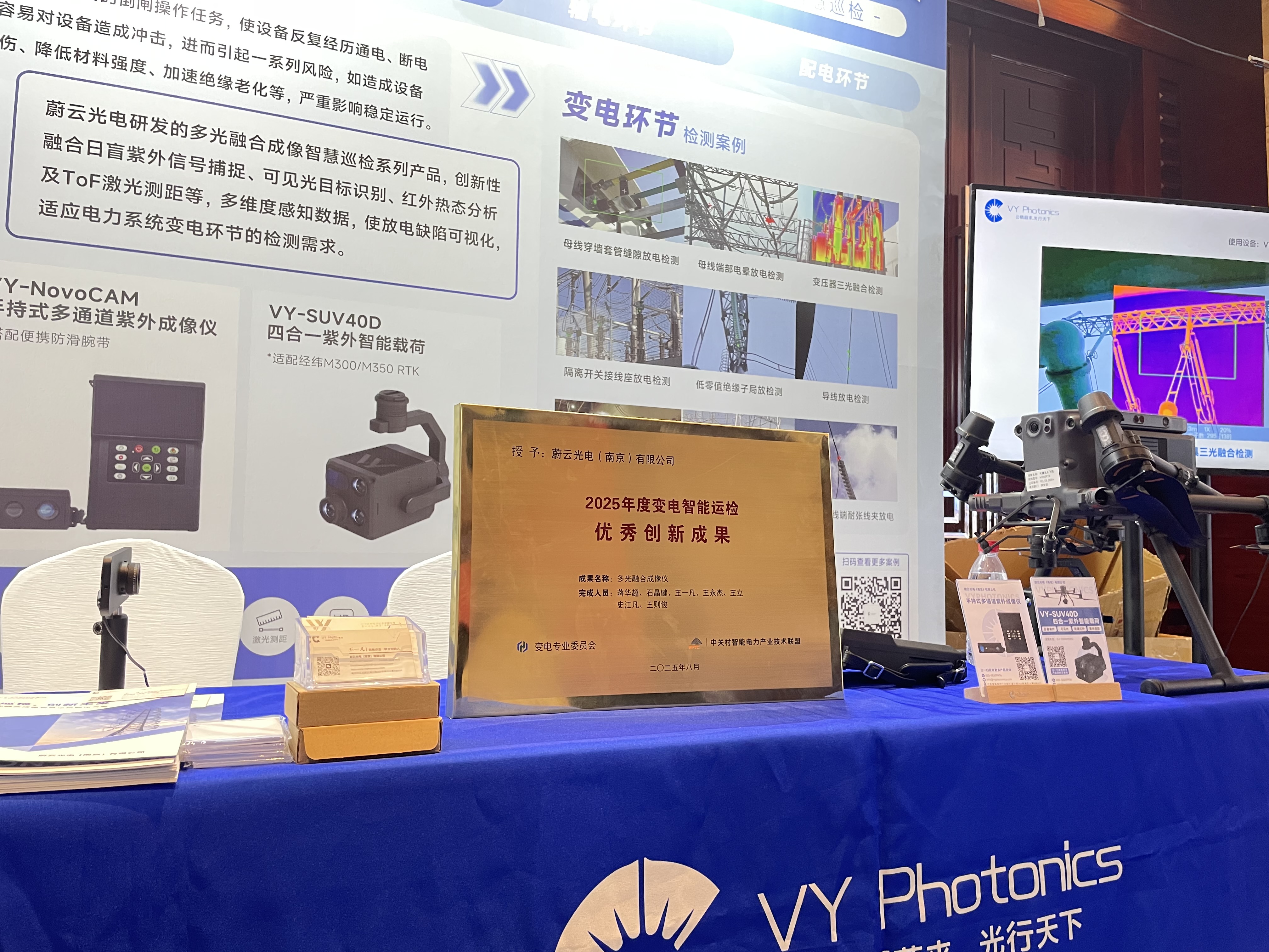 2025年11月6日,第三届电力行业智能巡检技术大会在广州市隆重举行。会上,蔚云光电(南京)有限公司凭借自主研发的VY-SUV40D四合一无人机紫外智能载荷产品,成功斩获2025年度智能巡检优秀创新成果奖。