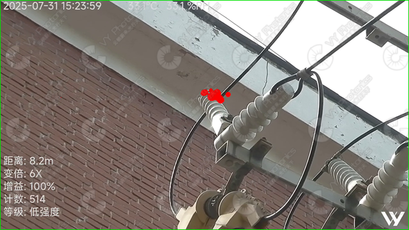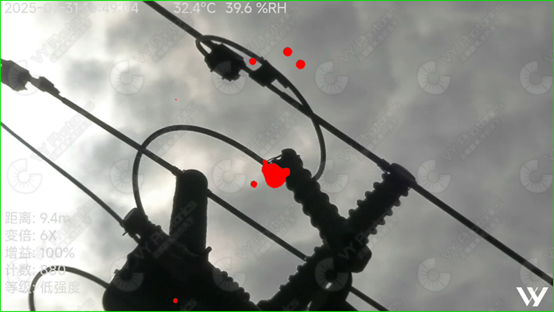 2025年10月,在某±800kV换流站年度检修中,蔚云光电VY-NovoCAM手持式多通道紫外成像仪精准捕捉到换流变网侧套管顶端夹件存在异常放电信号。