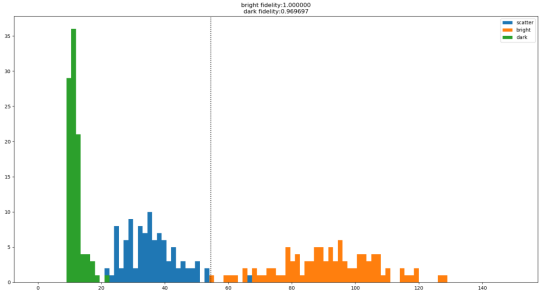 拍照保存100张图片,对于离子区域像素亮度进行统计,橙色为亮离子计数,蓝色为暗离子计数(开启读出激光,有背景杂散光),绿色为关闭读出激光时的纯背景计数