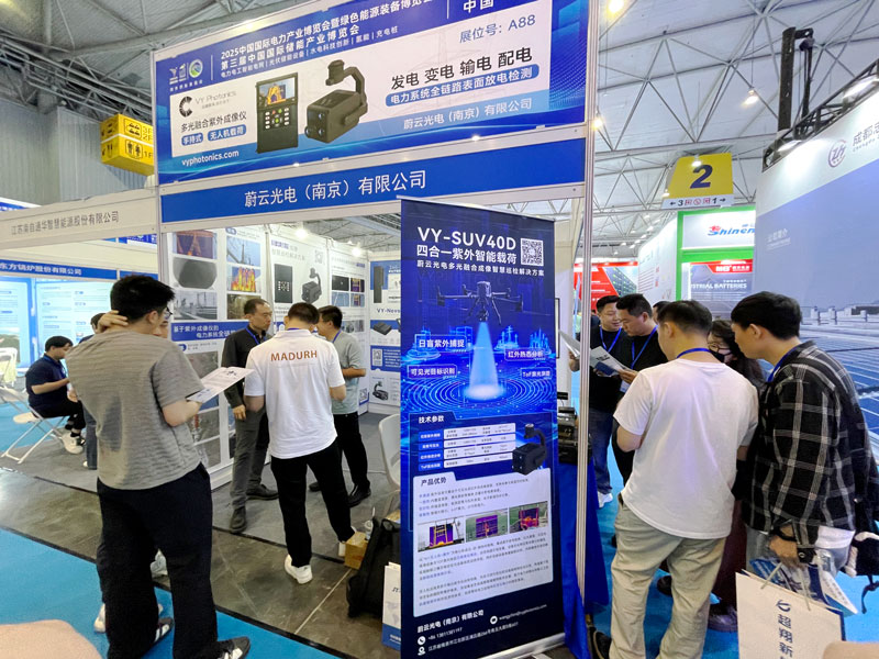 展会期间蔚云光电展位迎来了众多嘉宾和专业观众的访问。蔚云光电自主研发的多光融合成像仪,具有多光融合放电可视化、直接探测局部放电、精确定位缺陷位置、平均光子数缺陷等级自动判定等优势。可为水电发电、变电、送电工程提供高效的巡检检缺手段,及时发现电力系统的局部放电缺陷,预防电气设备在高湿度环境中极易发生的受潮放电、绝缘劣化、材料锈蚀、雷击侵害等因素导致的系统非计划性停运事故。详细展示的应用效果得到了现场观众的一致肯定。